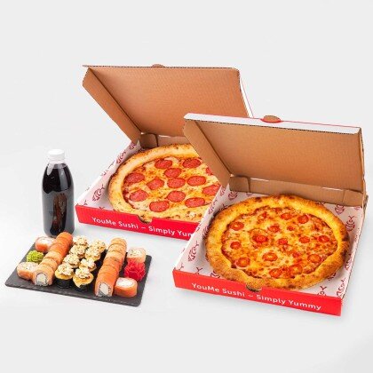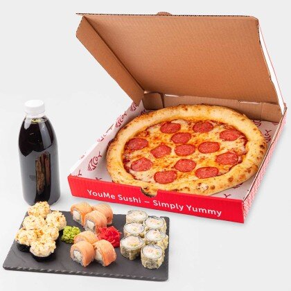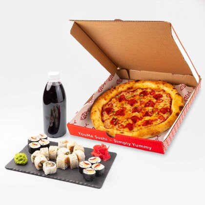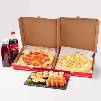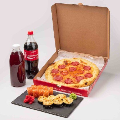 Филадельфия Classic х8 - 2 шт. Сливочная креветка х8 - 1 шт. Запеченный ролл Калифорния с креветками х8 - 1 шт. Наггетсы куриный - 1 шт. Пеперони - 2 шт. Картофель фри - 2 шт. Напиток на выбор - 3 л.