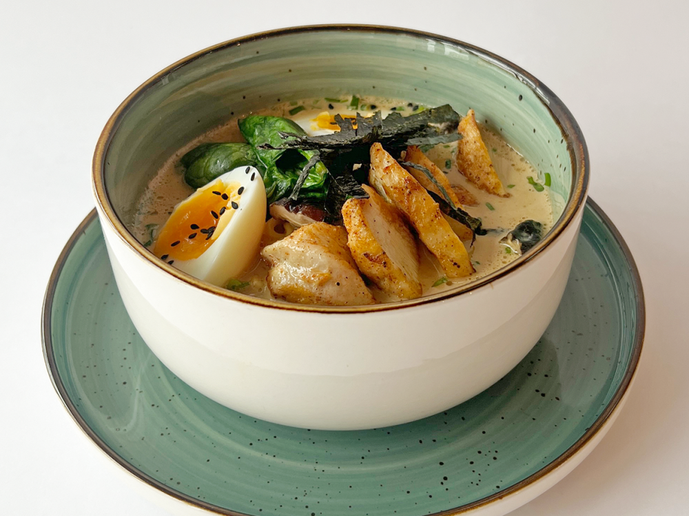 Куриное филе, сыр, ароматный куриный бульон, зеленый лук, яйцо всмятку, нори. Украшается свежей зеленью.